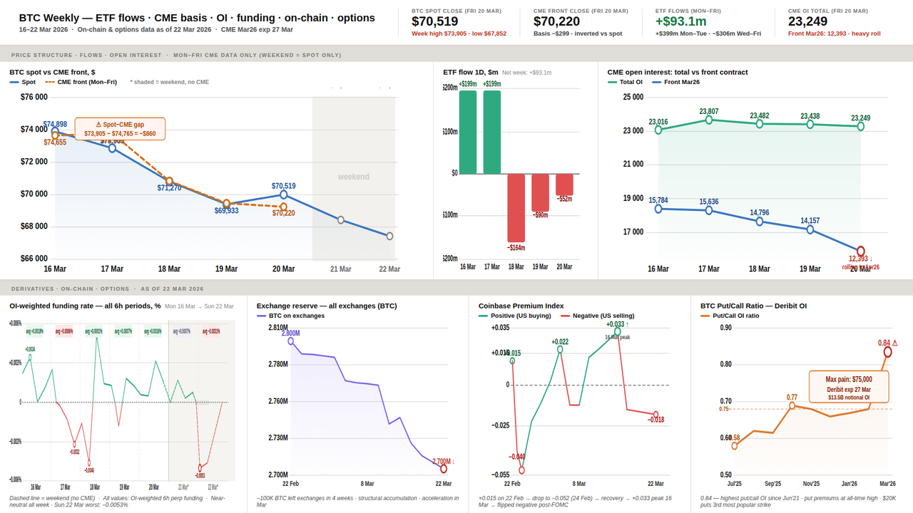 Put/Call Deribit - the market is buying insurance. The P/C OI ratio reached 0.84 - the highest since June 2021. The $20,000 strike put became the third most popular strike by notional with $596m in open interest. This is tail-risk hedging against geopolitical shocks and oil spikes, not a directional bet on collapse. And yet the overall P/C at 0.63 means calls still dominate in aggregate - the market hasn't capitulated. Max pain for March 27 sits at $75,000, with $13.5 billion notional expiring on Deribit.